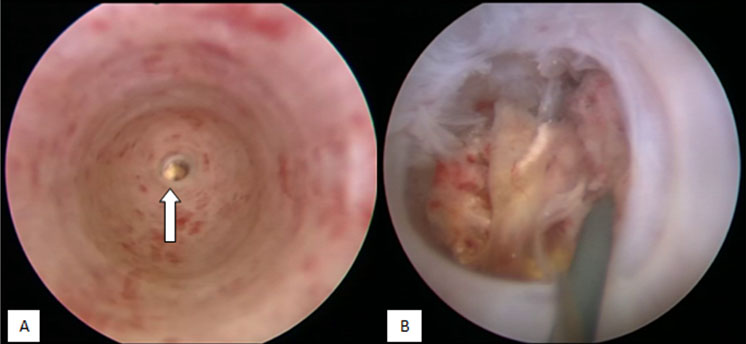 A 47-year-old male presented with two months history of obstructive urinary symptoms and intermittent per urethral bleed. Ultrasound revealed mild prostatomegaly with significant post-void residual urine. Uroflowmetry was suggestive of decrease maximum flow and stricture pattern. Retrograde urethrogram confirmed stricture in mid-bulbar urethra and filling defect proximal to it with possibility of either radiolucent calculus or soft tissue mass (Figure 1). Magnetic resonance imaging (MRI) reported it as altered intensity polypoidal lesion in bulbar urethra suggestive of urethral malignancy (Figure 2). Cystoscopy revealed mid-bulbar stricture and polypoidal lesion proximal to it with overlying calcified material imitating as malignancy (Figure 3A and Figure 3B). Optical internal urethrotomy and transurethral resection of mass were done with transurethral resection loop without cutting current followed by optical internal urethrotomy for another stricture proximal to it with no skip lesion elsewhere. Histopathology confirmed the lesion as NA with positive immunohistochemistry for CK7, PAX 2, and negative for p63. Foley catheter was removed after five days and the patient is asymptomatic till date.