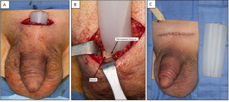The following day, the patient was taken to the operating room (OR) for explant of silicon penile implant and washout. Incision was made through his prior infrapubic surgical site and dissection was directed toward implant. Capsule was identified and entered with immediate release of purulent fluid. Culture later showed Staphylococcus aureus resistant to ampicillin, clindamycin, and penicillin as well as Cutibacterium acne. The cavity was opened laterally to the distal end of the implant on both sides. The proximal end of the implant was delivered through the incision and mesh and permanent suture anchoring the implant to the distal penis was visualized. The Penuma was then removed through incision after cutting sutures (Figure 2). The mesh was not removed as it was deeply imbedded in the penile tissue. The risks of leaving the mesh in place include pain and infection; however, removal would have led to greater tissue damage and possibly more chronic pain. We decreased the infection risk by using the following steps: the implant cavity was copiously irrigated with double antibiotic solution and half inch Penrose drain was placed into the capsule, exiting just lateral to incision. The subcutaneous tissue was closed with 2-0 vicryl interrupted and epidermis was approximated with surgical staples.
