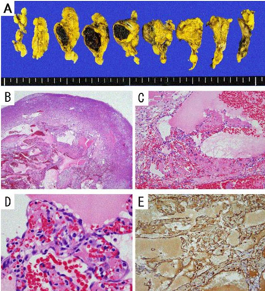 A 66-year-old Japanese man was hospitalized for the treatment of a left adrenal tumor. The tumor was first discovered incidentally in 2015 and had been followed up by computer tomography (CT). The patient had a past history of gastric cancer. The patient was followed for five years until 2020, when the size of the tumor had increased from 15 mm in length in July 2015 to 28 mm in July 2020 (Figure 1). The results of laboratory tests including hormonal values revealed no abnormality. A laparoscopic total adrenalectomy was performed on September 11, 2020. In gross findings, the tumor was 21 × 13 × 18 mm in size and contained some areas of necrosis and calcification (Figure 2A). The vascular tumor in medulla was observed in HE stain (Figure 2B). In microscopic findings, some irregular blood-filled vascular spaces with and endothelial lining were observed (Figure 2C). A papillary-expanding lesion of the mass was lined with a single layer of endothelial cells (Figure 2D). The immunohistochemical result was positive for blood coagulation factor VIII, demonstrating the tumor’s endothelial nature (Figure 2E). No evidence of malignancy was identified. The pathological diagnosis was cavernous hemangioma in the medulla of the left adrenal gland. There was no adverse event after the patient’s adrenalectomy, and there has been no evidence of recurrence since then.