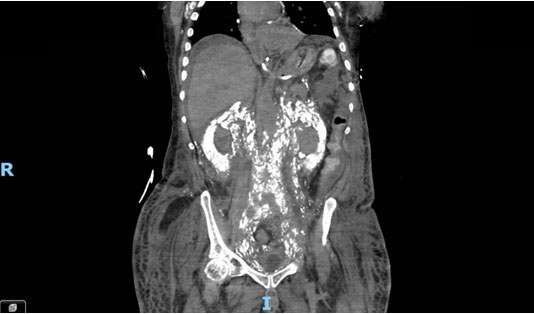 During admission, stage IV acute-on-chronic kidney injury did not respond to diuresis. Medical management of hyperkalemia included gentle diuresis as well as temporizing measures of dextrose, insulin, and calcium gluconate. Management of hyponatremia was accomplished with intravenous (IV) fluid administration and frequent laboratory checks to avoid overcorrection. Urology was consulted on hospital day 3. Based on previous ureteroscopy showing narrowed right ureter, there was concern for ureteral obstruction contributing to kidney injury compounded by massive prostatomegaly and narrow bladder neck. The patient and family were presented with treatment options including observation, ureteral stent placement, and interventional radiology directed percutaneous nephrostomy or nephroureteral stent placement. After consideration, the patient elected to move forward with nephroureteral stent placement on hospital day 19 to address hydronephrosis and UTI as well as refractory acute kidney injury (AKI) on CKD (Cr 3.0, GFR 21). Left nephroureteral stent placement was successful; however, the right nephroureteral stent was unable to be placed due to ureteral narrowing. Right percutaneous nephrostomy tube was placed. Subsequently, the patient experienced continued oliguria and worsened gross hematuria. A computed tomography (CT) scan of the abdomen and pelvis was performed to rule out retroperitoneal hemorrhage and confirm placement of the stent and tube.
