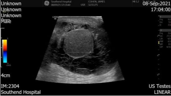 A 45-year-old male patient was referred to the urology department by his General Practitioner (GP) for right sided scrotal swelling. He was reviewed by the GP in December 2019 and had an ultrasound scan of the scrotum showing a 9 cm right sided hydrocele with no other underlying testicular pathology. He was referred to the urology team in January 2020. Due to the COVID-19 pandemic, he received a non-face-to-face urology appointment only in February 2021.