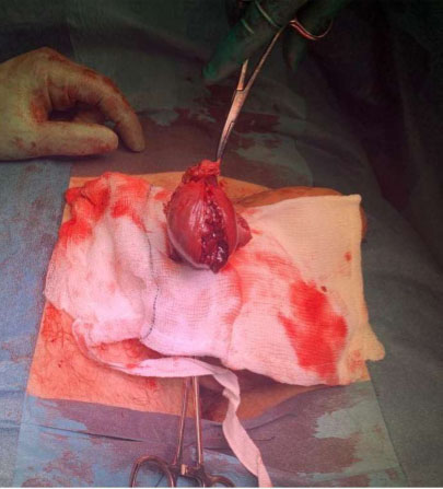 Arrangement was made for him to have the procedure later that same day. Intra-operative findings were consistent with the ultrasound scan. The previous surgical wound had healed well. The right scrotum was mildly swollen with ongoing cellulitis of the scrotal wall. A scrotal hematoma was evacuated revealing a necrotic right testicle which was ligated and removed (Figure 3). A corrugated surgical drain was inserted in the scrotum.