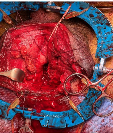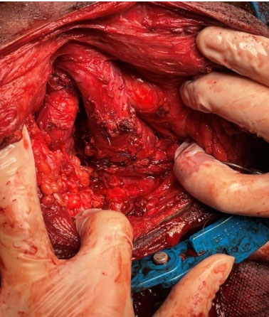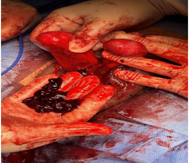 A 23-year-old male presented to the emergency department with complaints of scrotal swelling and pain for three hours due to fall from height on perinium. He had classic signs of a urethral injury and penile fracture. On physical examination he had blood at the meatus, scrotum swelling, butterfly perineal ecchymosis, and he was unable to void (Figure 1). Lab results were within normal values and radiological images done with X-ray confirmed a pelvis fracture (Figure 2), computed tomography (CT) showed right proximal corpora cavernosa and spongiosa ruptures (Figure 3) also there are no other associated organs injuries such as bowel, renal, ureters, and bladder injuries. Foley catheter was succeeded after gentle single attempt, he underwent scrotal exploration for hematoma evacuation (Figure 4) and right proximal corpora cavernosa and spongiosa repair (Figure 5 and Figure 6). During hospital course post-procedure daily dressing, antibiotics, and Foley kept for three weeks then periurethral retrograde urethrogram (RUG) was done outside our hospital without any extravasation. Currently the patient voids freely.