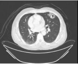 A 57-year-old male was presented with gross hematuria. He was a smoker. In CT imaging, he was found to have a mass in the right renal pelvis with other lesions involving the right ureter with hydronephrosis and multiple large lesions in the urinary bladder (Figure 1A, Figure 1B, Figure 1C). Cystoscopy showed extensive papillary growth covering most of the bladder surfaces that was partially resected, being beyond adequate complete resection. Histopathology showed UC in the right renal pelvis and bladder (non-invasive papillary UC). There was no evidence of distant metastasis initially. A bladder biopsy showed a high grade papillary UC with no invasion to the lamina propria (pTa). The patient underwent right radical nephroureterectomy, cystoprostatectomy, paracaval lymphadenectomy, bilateral pelvic lymph node dissection extending to common iliacs, and ileal loop conduit urinary diversion. The histopathological examination of the specimen revealed low-grade papillary UC involving the renal pelvis, the right ureter, and bladder (pTa, pN0) with all lymph nodes were negative for malignancy. On follow-up CT scans of the chest, abdomen, and pelvis he had no recurrence or metastasis until five years later, when he was found to have a growing mass in the upper lobe of the left lung with no abdominal metastases and no evidence of contralateral metachronous UTUC. The lung mass was irregular in shape and its maximum diameter reached 3 cm with central bubble and cavitation (Figure 2). The provisional diagnosis was lung adenocarcinoma.