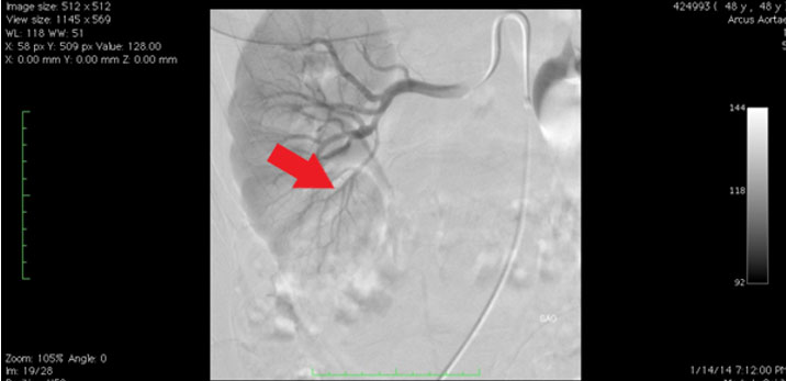 The main goal of treatment is to prevent persistent parenchymal loss and control hypertension (HT). Since our patient had a loss of renal parenchyma, renal angiography and angioplasty were performed for diagnosis and treatment. Fibromuscular dysplasia patients may present with renal colic because of renal ischemia, as in our case. However, the absence of hypertension and its course with RI is a rare condition in FMD [14],[15].