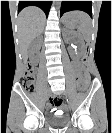 Upon clinical examination, the patient was stable hemodynamically and respiratorily, with a heart rate of 73 bpm, blood pressure of 13/7 mmHg, and afebrile at 36.8°C. Flank tenderness was noted on the left side, but there was no costovertebral angle tenderness. The rest of the examination was unremarkable.
