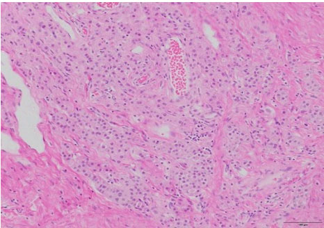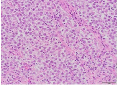 Surgical pathology revealed a 3.0 × 3.0 × 2.2 cm soft, pale-tan lobulated mass within the left testis (Figure 1). Histology demonstrated pure seminoma with concomitant Leydig cell hyperplasia and no other non-seminomatous germ cell components (Figure 2). The seminoma displayed the classic morphology of epithelioid tumor cells with clear cytoplasm, boxed-off nuclei, and fibrous bands with associated lymphocytes (Figure 3). Immunohistochemistry was not required for the diagnosis. Initial tumor markers (beta-HCG, LDH, and AFP) were normal.