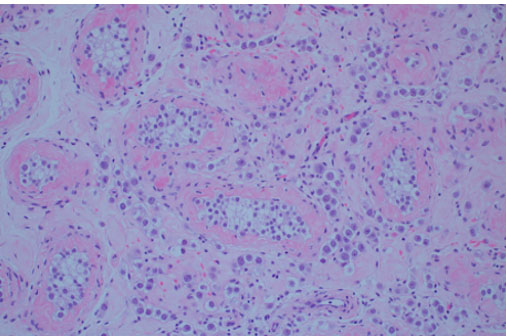 As described earlier, we identified a classical pure seminoma and a rare case of intertubular/interstitial pure seminoma. There is no difference clinically or biologically other than intertubular/interstitial pure seminoma is grossly normal and easily missed on both gross and histologic exam under the microscope. In the case of the above-described intertubular/interstitial seminoma, a methodical pathologic examination was crucial to secure the diagnosis, as the testicles were grossly normal. This underscores the importance of routine pathological inspection during gGAS, though the additional cost of pathology may be a barrier for patients pursuing self-pay gGAS.