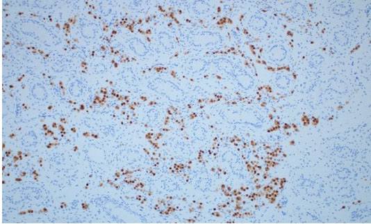 A simple bilateral orchiectomy was performed via a scrotal approach without complication, and the specimens were sent to pathology per routine protocol. Histology identified a subtle, 1.0 cm seminoma with intertubular growth (Figure 4) and associated germ cell neoplasia in situ (GCNIS). Given the atypical growth pattern, the morphologic impression was confirmed with OCT3/4 immunohistochemical stain, demonstrating strong staining in both seminoma and GCNIS (Figure 5). Grossly, the specimens were unremarkable.