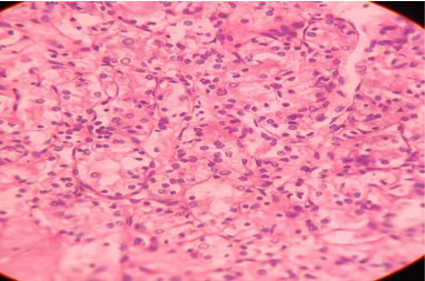 The cut section of the specimen revealed a partially necrotic exophytic mass in the central portion of the kidney. The histopathology report showed clear cell RCC (Figure 4).