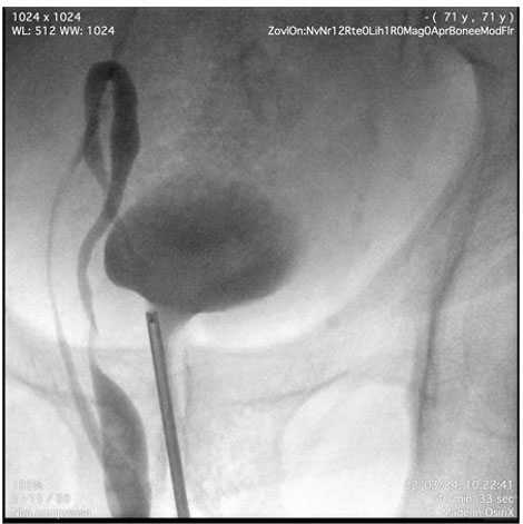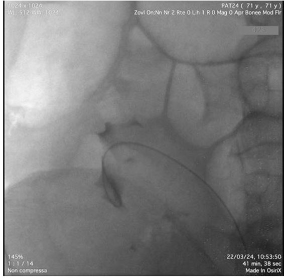 Pyelography was performed using an 8 Ch ureteroscope. After inserting the instrument into the bladder, the right ureteral meatus was identified and pyelography was performed with an open-ended catheter. The tortuosity of the ureter was confirmed, describing a double loop into the scrotum (Figure 2 and Figure 3). After identifying the renal pelvis, approximately in the right iliac fossa, a 6 Ch monoJ ureteral catheter was positioned.