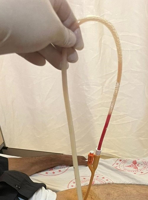 A 51-year-old male patient visited the urology outpatient clinic due to severe dysuria. It was discovered that he had previously under gone non-contrast CT because of macroscopic hematuria, which identified a tumor-like mass approximately 6 cm in diameter on the right lateral wall of the bladder (Figure 1). Consequently, the patient had a TUR of the tumor three weeks earlier and was discharged without any complications. His medical history included type 2 DM, diagnosed a decade ago. During the physical examination, the patient showed diffuse tenderness and pain in the suprapubic area. The patient had no fever at the time of admission. Laboratory results indicated a leukocyte count of 13,230/mm³ (reference: 4,300–10,300/mm³), a glucose level of 175 mg/dL (reference: 70–110 mg/dL), C-reactive protein of 14.8 mg/dL (reference: 0–0.5 mg/dL), HbA1c of 8.6% (reference: 4%–6%), and a creatinine level of 2.14 mg/dL (reference: 0.5–1.3 mg/dL). Urine analysis showed +3 erythrocytes and +3 leukocytes upon microscopic examination. His preoperative urine culture was sterile. The biochemical urine analysis revealed +2 protein and +3 glucose. No abnormalities were found in the urinary system ultrasonography (US). Given the initial diagnosis of a complicated UTI, a non-contrast abdominopelvic CT was conducted. On CT, diffuse thickening of all bladder walls and the presence of intramural air densities were noted within the bladder lumen, particularly in the area of the previous TUR on the right lateral bladder wall (Figure 2). The patient was admitted to the urology unit. Urine and blood cultures were taken. Intravenous broad-spectrum antibiotic treatment was initiated with meropenem at 1000 mg twice daily and moxifloxacin at 400 mg once daily. An 18 Fr urethral catheter was inserted for bladder drainage. Following catheterization, pneumaturia was observed (Figure 3). Bladder irrigation was conducted using normal saline. During the irrigation process, thick, foul-smelling infected urine containing solid particles was observed draining from the bladder (Figure 4). Irrigation continued until the urine was clear. During the follow-up in the ward, intermittent blockage of the catheter was noted. Therefore, daily bladder irrigation was continued. No microbial growth was detected in either urine or blood cultures. After 14 days of intravenous antibiotic treatment and continuous bladder drainage, the patient’s symptoms completely resolved, and laboratory values normalized. Follow-up imaging showed complete resolution of the previously observed diffuse bladder wall thickening and intramural air densities, and the patient was discharged in good condition (Figure 5).